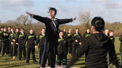 纪录片中,Jun Yang-Williams在教学生们做早操。